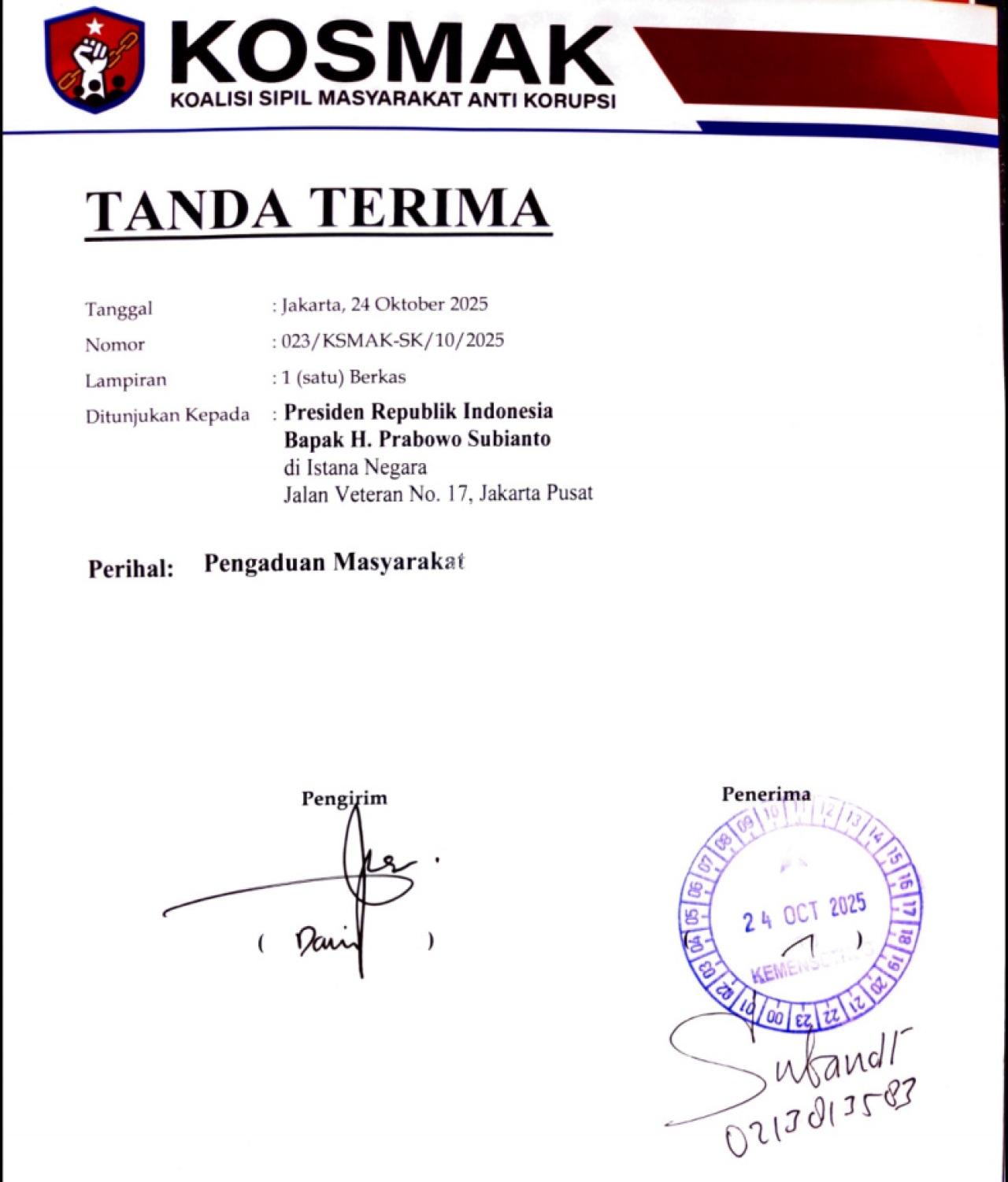 “Kami menilai ada indikasi penyalahgunaan kewenangan dan potensi praktik korupsi dalam pelaksanaan tugas Satgas PKH,” ujar Ronald Loblobly, Koordinator KOSMAK, usai menyerahkan laporan di Istana Negara, Jumat (24/10/2025).