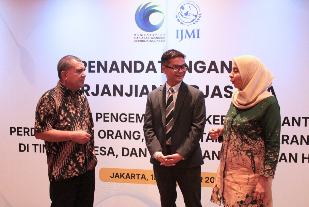 Perjanjian tersebut ditandatangani Direktur Eksekutif Yayasan IJMI, Try Harysantoso, dan Pelaksana Tugas Direktur Jenderal Instrumen dan Penguatan HAM, Dr. Harniati. Kerja sama mencakup pengembangan kebijakan pencegahan tindak pidana perdagangan orang (TPPO), penguatan kesadaran HAM di tingkat desa, serta pemajuan agenda bisnis dan HAM.