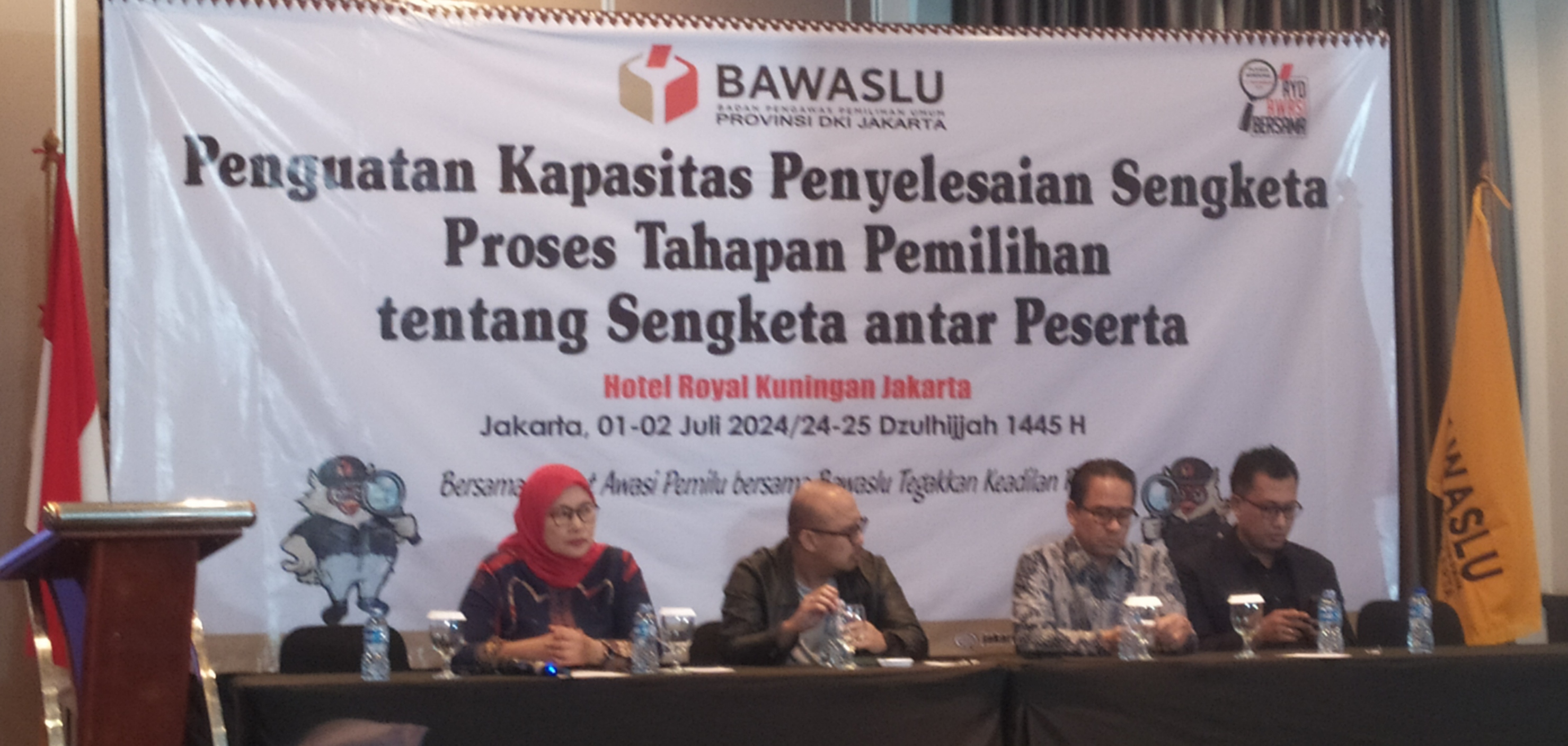 Kiri ke kanan Bawaslu Jakarta : Koordinator SDM dan Organisasi Rini Rianti Andriani, Koordinator Divisi Penyelesaian Sengketa Reki Putera Jaya, Koordinator Divisi Hukum, Pendidikan dan Pelatihan Sakhorji Koordinator Divisi Penanganan Pelanggaran Benny Sabdo, Hotel Royal Kuningan, Jakarta, Senin malam (1/7/2024). Foto : Andi (Tim Hukum Bawaslu Jakarta)