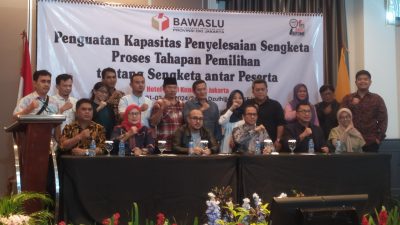 Theindonesiatimes.com – Koordinator Divisi Hukum, Pendidikan dan Pelatihan Bawaslu Jakarta, Sakhorji didampingi Koordinator SDM dan Organisasi Rini Rianti Andriani, Koordinator Divisi Penyelesaian Sengketa Reki Putera Jaya, Koordinator Divisi Penanganan Pelanggaran Benny Sabdo resmi menutup acara bertajuk Penguatan Kapasitas Penyelesaian Sengketa Proses Tahapan Pemilihan tentang Sengketa antar Peserta, Hotel Royal Kuningan, Jakarta, Senin malam (1/7/2024).