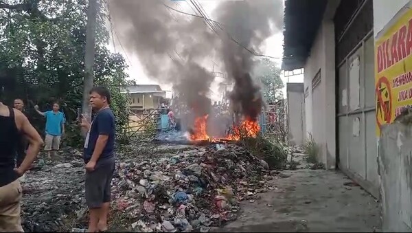 Terlihat situasi itu seluruh warga dengan kompaknya membakar ban-ban bekas.membuat Kepulan asap hitam dari aksi pembakaran sebagai tanda penolakan, turut mewarnai mereka yang berada dibarisan depan bersama orangtua dan keluarga mereka. Bahkan terlihat seorang pelajar sekali sekali mengusap wajah dan matanya dengan menggunakan kain hijab yang dipakainya.