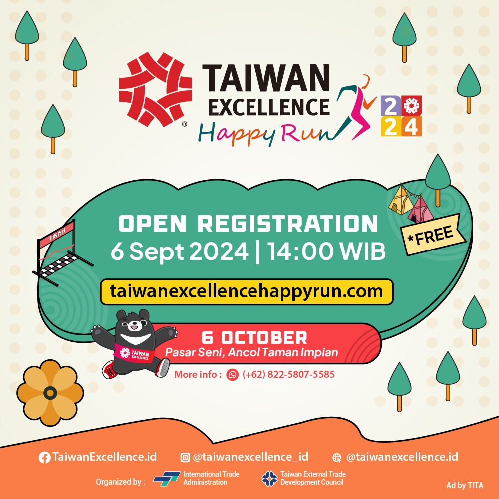 TheIndonesiaTimes - Taiwan Excellence Happy Run kembali digelar tahun ini di Ancol, Taman Impian, Jakarta Utara, pada tanggal 6 Oktober 2024. Hajatan yang diselenggarakan oleh International Trade Administration (TITA) dan Taiwan External Trade Development Council (TAITRA) akan menjanjikan hari yang penuh dengan semangat olahraga, kegembiraan, dan sekaligus memberikan pengalaman menikmati kebudayaan Taiwan yang tak terlupakan.