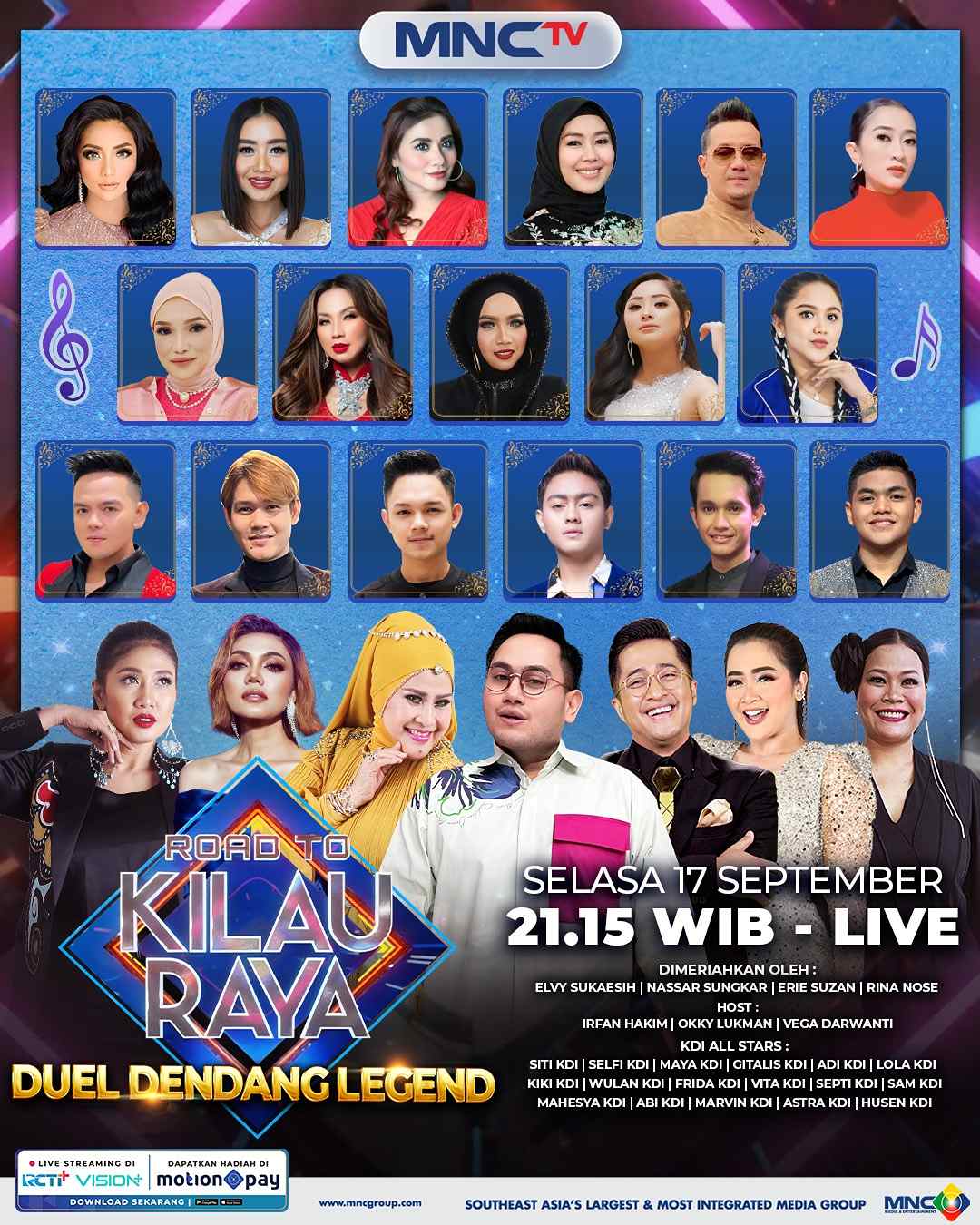 MNCTV menayangkan secara langsung konser Road To Kilau Raya 'Duel Dendang Legend' pada Selasa, 17 September 2024, pukul 21.15 WIB, malam ini.