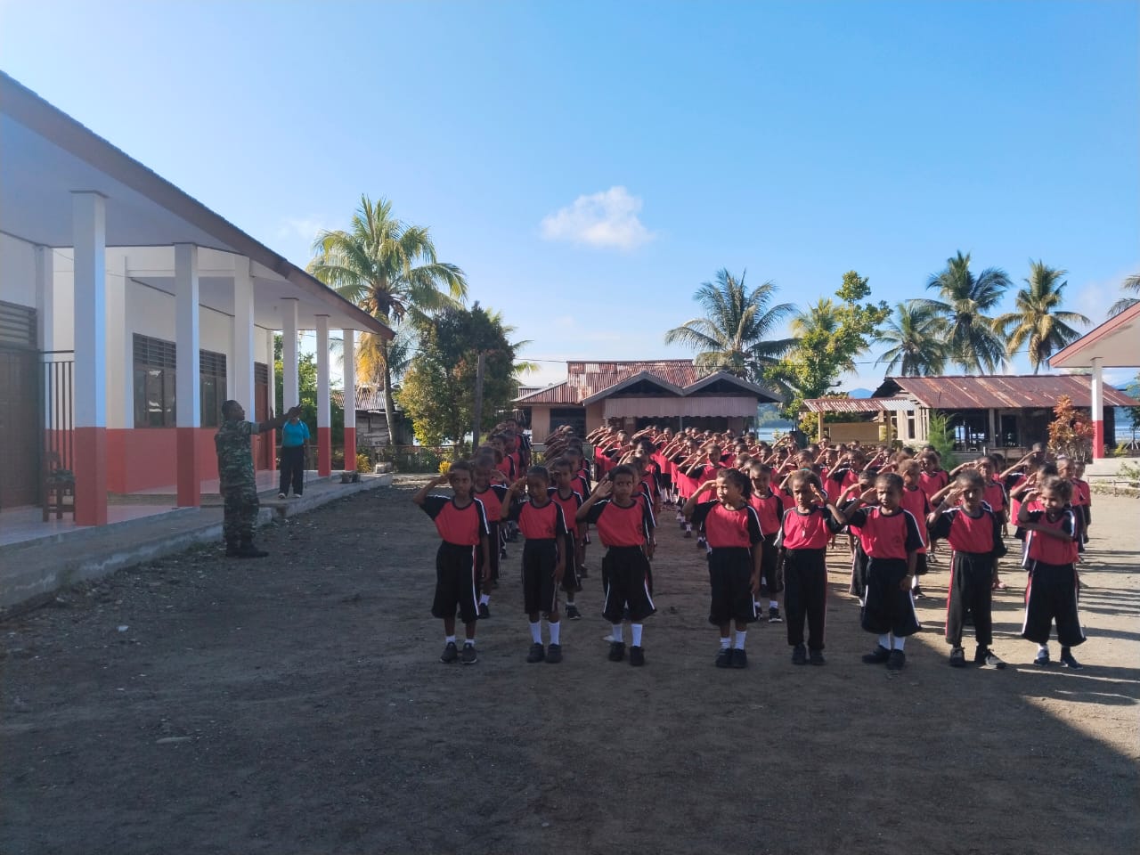 TheIndonesiaTimes - Anggota Satuan Tugas TNI Manunggal Membangun Desa (TMMD) Ke-122 Kodim 1805/Raja Ampat memberikan pelatihan Peraturan Baris Berbaris (PBB) kepada siswa-siswi SD Negeri 02 Raja Ampat pada Rabu (23/10/2024). Pelatihan ini dilakukan sebagai bagian dari kegiatan non-fisik dalam program TMMD, yang bertujuan untuk membentuk karakter dan disiplin para siswa serta mempererat hubungan TNI dengan masyarakat setempat.