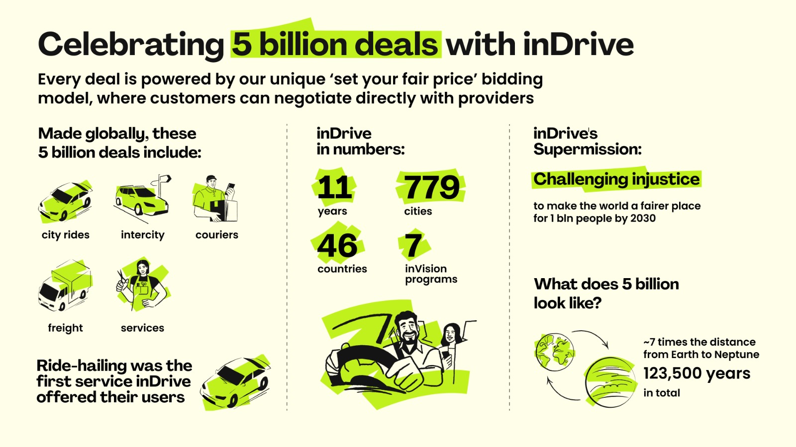 Sejak didirikan 11 tahun lalu, inDrive telah mengantarkan penumpang menempuh perjalanan total hingga 32 miliar kilometer atau setara dengan perjalanan selama 123.500 tahun. Selama periode ini, inDrive juga memperkenalkan layanan keuangan khusus bagi pengemudi di Meksiko, menunjukkan upaya perusahaan dalam mendukung kesejahteraan mitra pengemudi dan memberdayakan masyarakat di seluruh dunia.